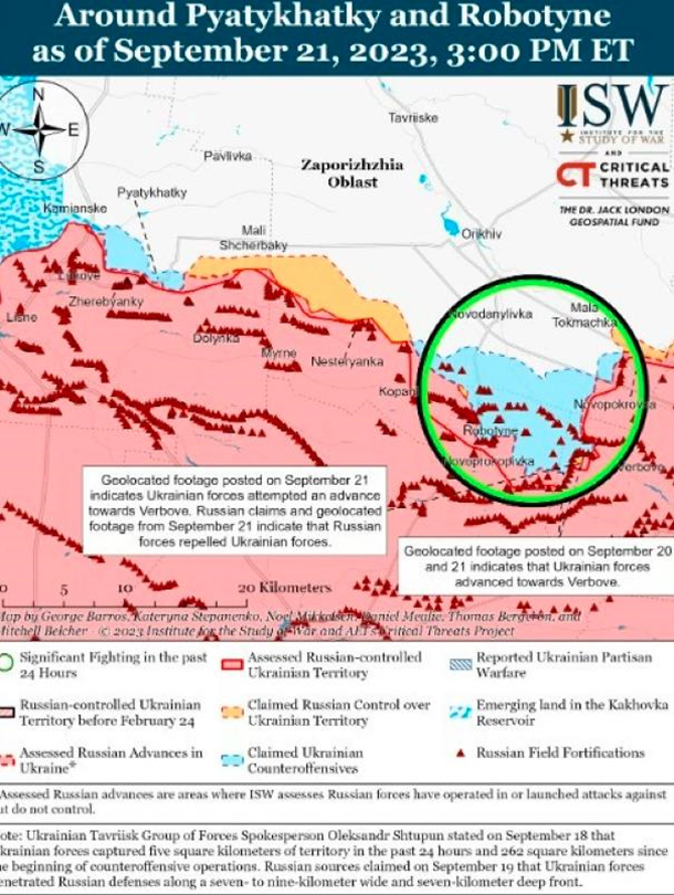 На свіжих кадрах, опублікованих 21 вересня, видно, що українська бронетехніка просунулася південніше російських протитанкових ровів (і так званих "зубів дракона", які є частиною трирівневої оборони), і веде обмежені битви безпосередньо на захід від Вербового (18 кілометрів на південний схід від Оріхіва).