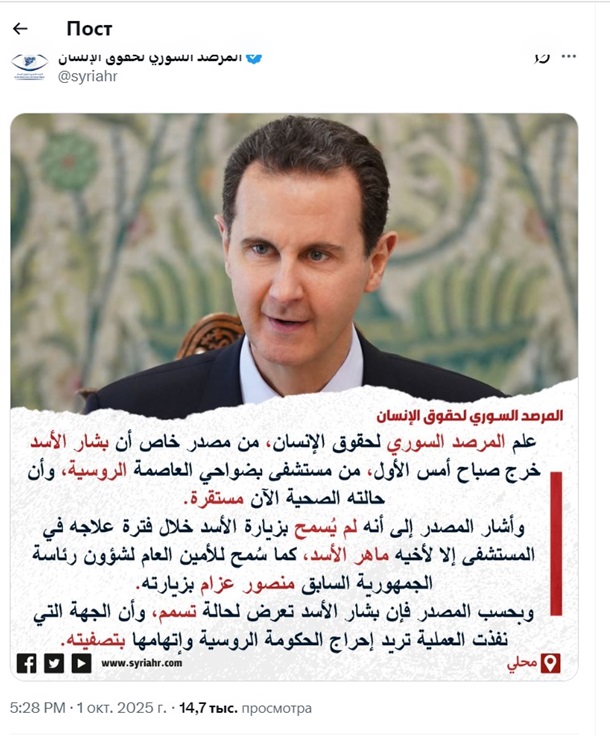 Лікарі оцінили стан Башара Асада як стабільний, але йому було надано інтенсивну допомогу. Його вже виписали з медустанови.