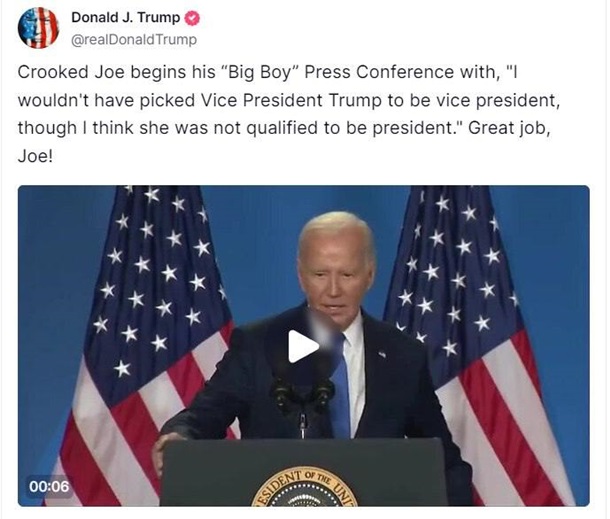 Так, відповідаючи про продовження своєї участі у перегонах, та про те, чи може Байден поступитися місцем віцепрезидентці Камалі Гарріс, Байден знову припустився помилки і переплутав її прізвище. Іронічно, що він назвав свою віцепрезидентку "Трампом".