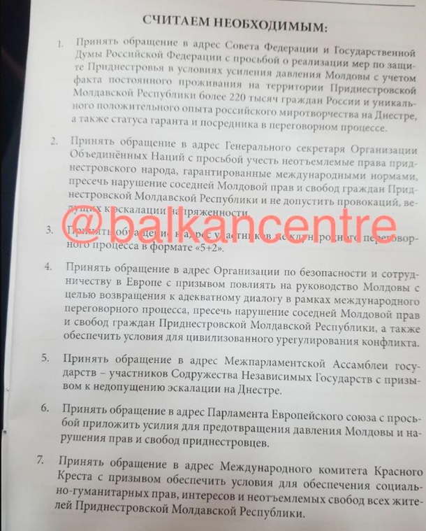"Прийняти звернення на адресу Ради Федерації та Державної думи РФ з проханням про реалізацію заходів щодо захисту Придністров’я в умовах посилення тиску Молдови з урахуванням факту постійного проживання на території Придністровської Молдавської Республіки понад 220 тисяч громадян Росії та унікального позитивного досвіду російської миротворчості на Дністрі, а також статусу гаранта та посередника у переговорному процесі", - йдеться у резолюції, яку раніше опублікували ЗМІ.