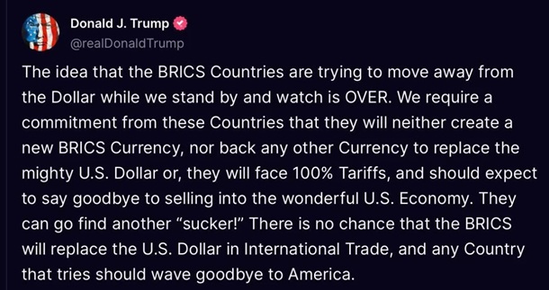 За його словами, американський уряд вимагатиме від цих країн зобов'язання, що вони не створюватимуть нову валюту БРІКС, і не підтримуватимуть будь-яку іншу валюту для заміни "могутнього долара США".