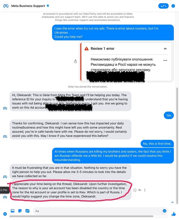 Він звернувся у службу підтримки Meta через відмову Facebook опублікувати оголошення, оскільки рекламодавець нібито перебуває на території Росії. Чоловік зауважив, що його обурює той факт, що поки РФ вбиває українців, соцмережа ідентифікує його як росіянина.
