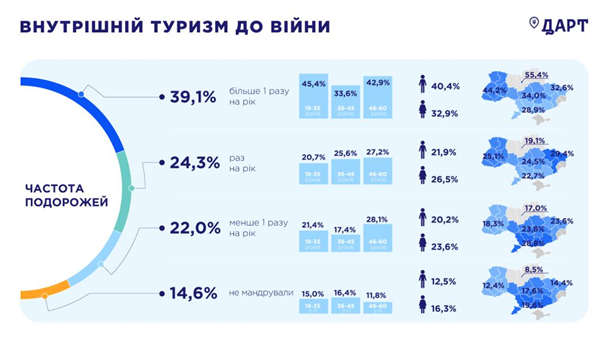 До початку повномасштабного вторгнення Україною подорожували понад 85% респондентів. Найактивнішими мандрівниками, які подорожували країною більше одного разу на рік, виявилися жителі столиці та західних регіонів - 39%.