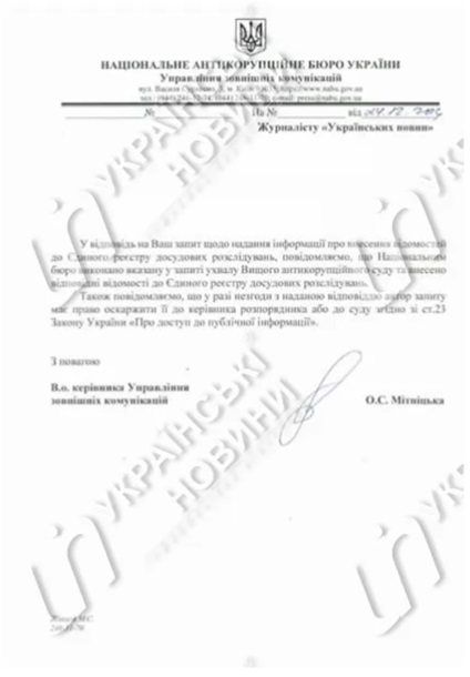 В ответе, в частности, указано, что открыть соответствующее производство НАБУ обязал Высший антикоррупционный суд. С требованием открыть дело, в свою очередь, в суд обратилась адвокат экс-нардепа Олега Ляшко Элеонора Саловая.