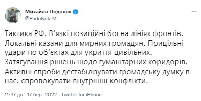 Радник глави Офісу президента Михайло Подоляк описав тактику воєнних дій РФ в Україні. Про це він написав у Twitter 17 березня.