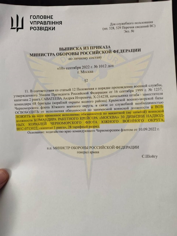 У флагмана російського Чорноморського флоту крейсера Москва, відповідно до датованого 10 вересня 2022 року документа, з’явився новий командир - Саватеєв Андрій Ігорович.