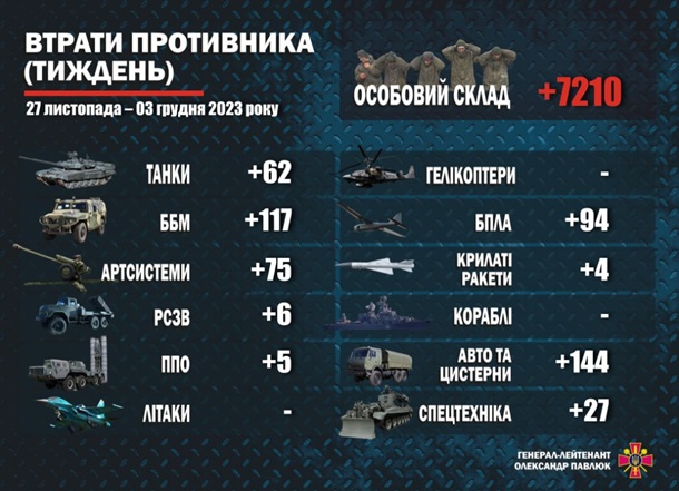 Перший заступник міністра оборони України генерал-лейтенант Олександр Павлюк повідомив також про знищення 534 роійської військової техніки.