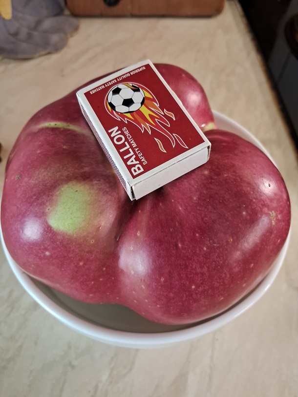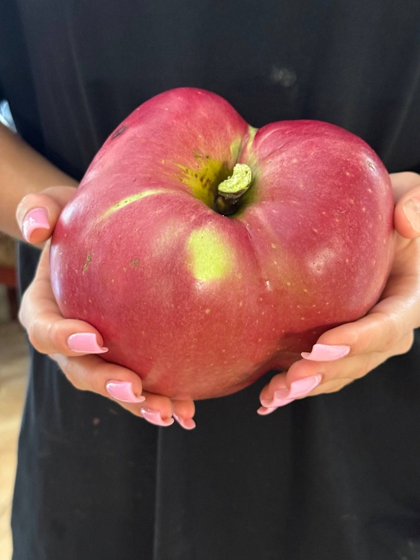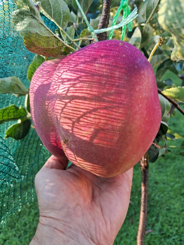 Яблуко-гігант вагою в 1 кілограм 281 грам має обхват у 50 см. Щоб гілка дерева витримала, довелося використовувати підв’язки і з усіх боків ставити підпори.