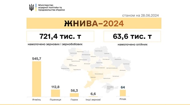 За даними Мінагро, намолочено 36,2 тис. тонн пшениці з 36,2 тис. га, урожайність - 31,2 ц/га; 545,7 тис. тонн ячменю з 145,8 тис. га, урожайність - 37,4 ц/га; 56,3 тис. тонн гороху з 25,9 тис. га, урожайність 21,7 ц/га. Загалом намолочено 721,4 тис. тонн зерна з 209,8 тис. га