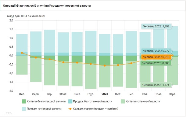 Всього з початку 2023 року українці продали 8,457 млрд доларів і купили на 10,347 млрд доларів. Чиста купівля валюти становила 1,890 млрд доларів.