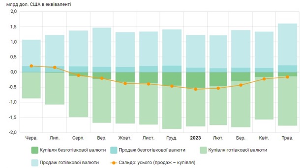 Жителі України у травні 2023 року продали комерційним банкам готівкової та безготівкової валюти на 1 608,7 млн доларів (в еквіваленті), а купили на 1 767,4 млн доларів. Чиста купівля валюти становить 158,6 млн доларів. Про це повідомляє НБУ.