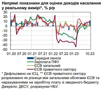 Непрямі показники оцінки доходів населення України свідчать про їхнє зростання в реальному вимірі з огляду на інфляцію. Про це йдеться в Макроекономічному та монетарному огляді Національного банку України за грудень 2023 року.
