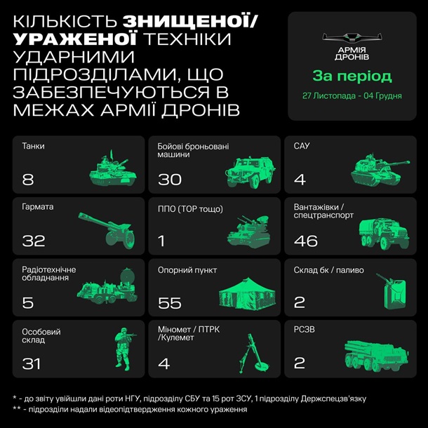 Ударні роти БпЛА уразили 30 бойових броньованих машин, 32 гармати та 55 опорних пунктів окупантів.