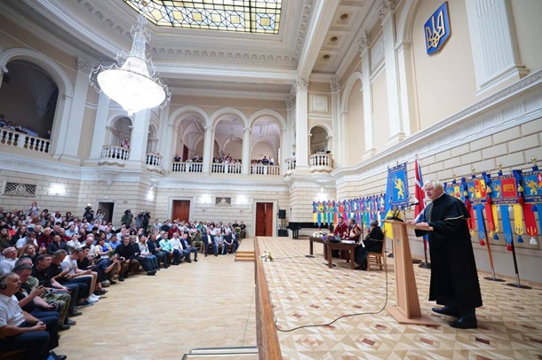 "Я знаю, що ви переможете. Як казав ваш ректор, ви переможете. Україна переможе. Не дивлячись на їхні поранення, я бачу їхні серця левів. І вони розповіли мені, як крок за кроком їхні підрозділи звільняють свою країну від загарбників. І коли ви переможете, українське військо переможе, вони звільнять і будуть вільною, суверенною, незалежною європейською державою. І вони проливали кров за свободу в усьому світі", - сказав Борис Джонсон приймаючи звання доктора.