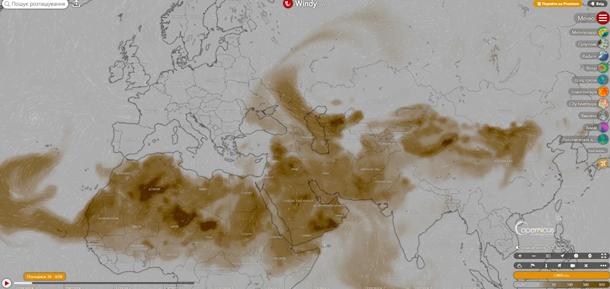 Основна маса пилу йде в Україну з Казахстану, Узбекистану та Росії. Сьогодні вночі та завтра вдень, 1 жовтня, ситуація погіршиться щонайменше у п'ять разів, прогнозує Windy.