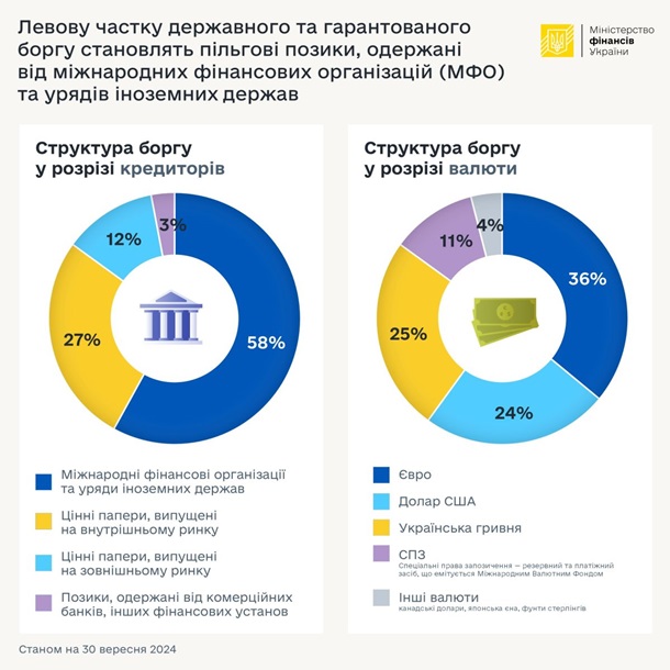 В розрізі валютної структури державного та гарантованого боргу частка євро - 36%, гривні - 25%, долари - 24%, СПЗ - 11%, а в інших валютах, зокрема у фунтах стерлінгів, канадських доларах та японських єнах - 4%.