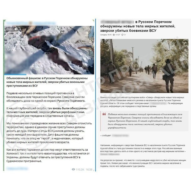 "Російська пропаганда вкотре поширює дезінформацію про нібито убивства цивільних у селі Руське Порічне на Курщині. Як докази ru-пропаганда поширює відео, на якому зафільмовано тіла кількох загиблих людей. Поширене відео не містить жодних справжніх доказів. З нього неможливо встановити ані кількість тіл, ані місце подій, ані особи загиблих, ані причини та обставини їхньої смерті", - йдеться в повідомленні.