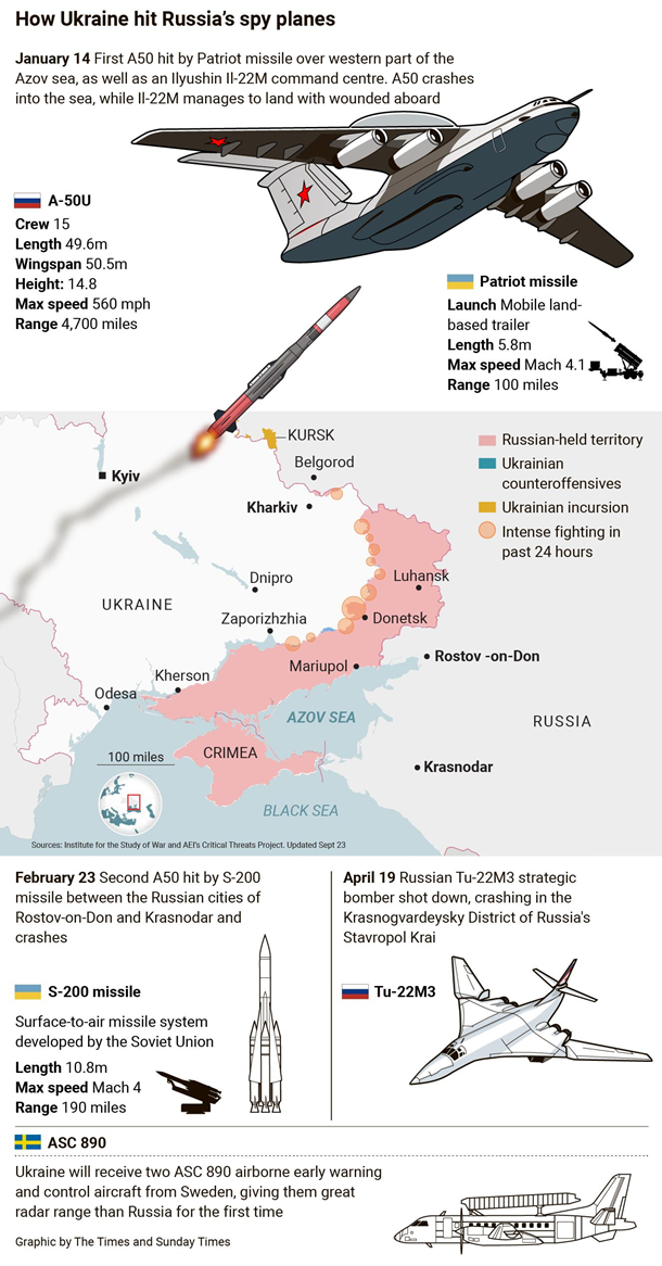 Під час полювання за літаками далекого радіолокаційного виявлення та управління А-50 українські сили застосовували ракети радянських часів. Також використовувалися комплекси Patriot. Про це пише The Times.
