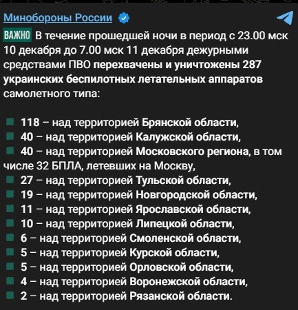 "Протягом минулої ночі... черговими засобами ППО перехоплено і знищено 287 українських безпілотних літальних апаратів літакового типу", - стверджують росіяни.