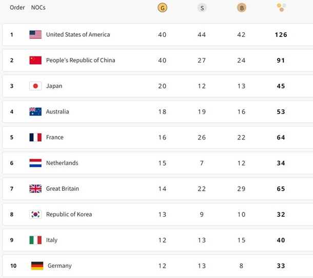 Спортсмени з обох країн здобули по 40 золотих медалей, але за рахунок більшої кількості срібних нагород (44 проти 27) переможцем медального заліку Олімпіади-2024 стали США.