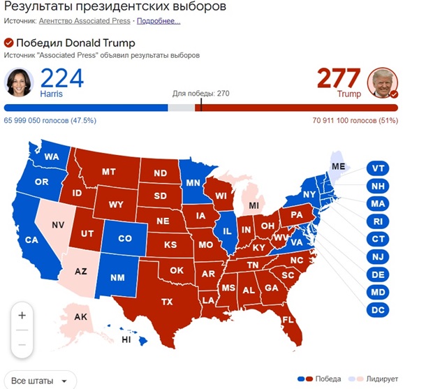 Разом з тим інтерактивна карта агентства показує, що наразі у Трампа вже 277 голосів виборників. Його конкурентка від Демократичної партії Камала Гарріс набрала лише 224 голоси.